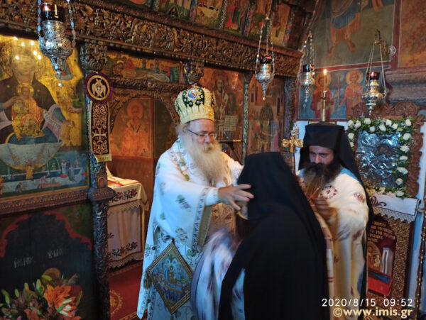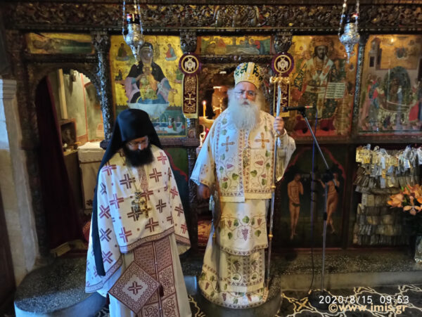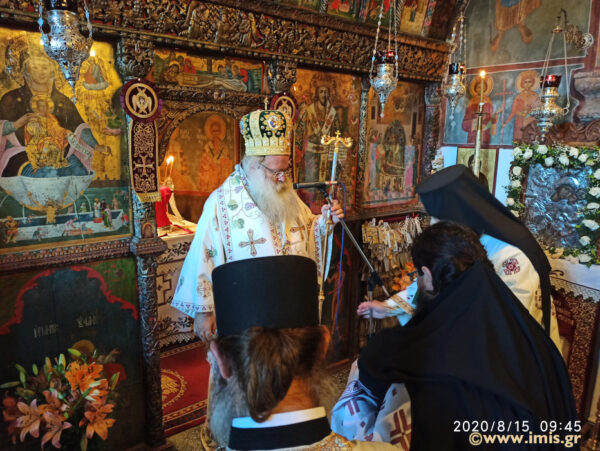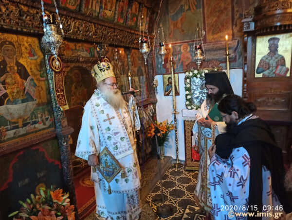 Ανήμερα της εορτής της Κοιμήσεως της Θεοτόκου, Σάββατο 15 Αυγούστου 2020, τελέσθηκε η ακολουθία του Όρθρου, κατά την οποία χοροστάτησε ο Σεβ. Μητροπολίτης Ιεραπύτνης και Σητείας κ. Kύριλλος, ο οποίος ευλόγησε τους άρτους και στη συνέχεια ιερούργησε, περιστοιχούμενος από τον Πρωτοσύγκελλο της Ι. Μητροπόλεως και τους Πατέρες της Μονής.