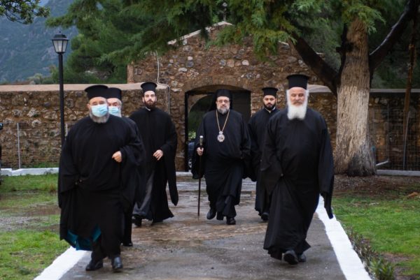 Τον Σεβασμιώτατο πλαισίωσαν ο Πρωτοσύγκελλος της Ιεράς Μητροπόλεως Μεσσηνίας Αρχιμ. Φίλιππος Χαμαργιάς, ο Καθηγούμενος της Ιεράς Μονής Βουλκάνου Αρχιμ. Προκόπιος Σμυρνής και ο Διάκονος Θεόφιλος Κυριάκος, ενώ παρούσα ήταν και σύμπασα η αδελφότητα της Ιεράς Μονής Βουλκάνου.