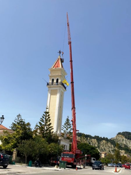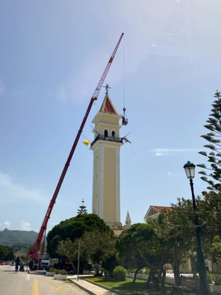 Εργασίες συντήρησης ηλεκτροφωτισμού πραγματοποιούνται σήμερα στο καμπαναριό της Ιεράς Μονής Αγίου Διονυσίου στη Ζάκυνθο, τις οποίες πραγματοποιεί αφιλοκερδώς η κατασκευαστική εταιρεία ΤΕΚΟ Βλασόπουλος.