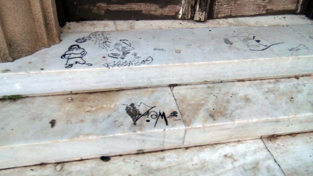 ΖΑΚΥΝΘΟΣ – Μαρκαδόροι και ανεπίτρεπτα συνθήματα στα μάρμαρα του Ιερού Ναού της Ιεράς Μονής του Αγίου Διονυσίου, σκουπίδια στην πλατεία και στα παρτέρια αυτής, άλλες «ζωγραφιές» στην προτομή του Ουσάκωφ και άλλα πολλά, περιλαμβάνουν οι επίκαιρες εικόνες του ενός ανόητου βανδαλισμού.