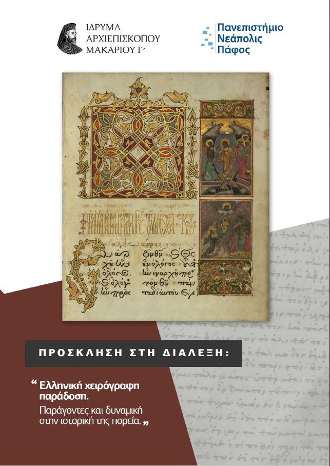 Υπό την αιγίδα του Μακαριωτάτου Αρχιεπισκόπου Κύπρου κ. Χρυσοστόμου Β΄, το Ίδρυμα Αρχιεπισκόπου Μακαρίου Γ΄, και το Πανεπιστήμιο “Νεάπολις” Πάφου διοργανώνουν το Σάββατο, 11 Μαΐου 2019 και ώρα 19:00 διάλεξη με θέμα: «Η Ελληνική χειρόγραφη Παράδοση. Παράγοντες και δυναμική στην ιστορική της πορεία» και ομιλητή τον Επίκουρο Καθηγητή του Πανεπιστημίου “Νεάπολις” Πάφου πρωτ. Κωνσταντίνο Ε. Κωστάκη.