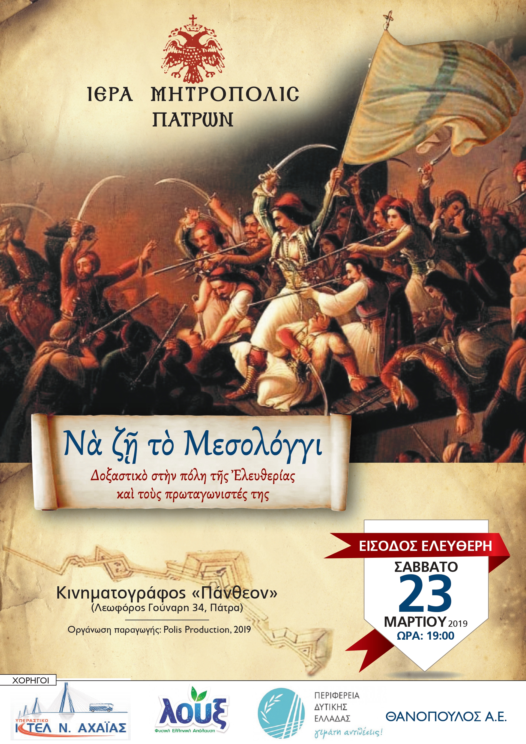 Ἡ Ἐκδηλώση θά πραγματοποιηθῇ μέ τήν εὐκαιρία τῆς Ἐπετείου τῆς 25ης Μαρτίου 1821. Κατά τήν διάρκεια τῆς Ἐκδηλώσεως θά ὁμιλήσῃ ἐπικαίρως ὁ Σεβασμιώτατος Μητροπολίτης Πατρῶν κ.κ. Χρυσόστομος, ἐνῶ θά συμμετέχουν ἡ μουσική ὀρχήστρα καί οἱ χορωδίες τοῦ 1ου Γυμνασίου, τοῦ 1ου Γενικοῦ Λυκείου καί τοῦ Φιλοκαλλιτεχνικοῦ Συλλόγου Μεσολογγίου.
