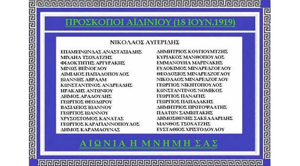 Σαν σήμερα, στις 18 Ιουνίου 1919, οι τσέτες ολοκλήρωναν το έργο της τριήμερης άγριας σφαγής με θύματα πάνω από χίλιους Έλληνες στην περιοχή του Αϊδινίου. Ανάμεσά τους ήταν 31 πρόσκοποι που σφαγιάστηκαν από τους τσέτες, αλλά και δεκάδες άλλα νεαρά μέλη του Σώματος που πρόσφεραν κοινωνικό έργο στην Ιωνία των αρχών του προηγούμενου αιώνα. Με αφορμή αυτό το γεγονός, από την ιστοσελίδα του Σώματος Ελλήνων Προσκόπων (www.sep.org.gr) αναδημοσιεύουμε άρθρο για τη σφαγή των προσκόπων του Αϊδινίου με τίτλο «Αϊδίνι 1919 – Η υπέρτατη θυσία»: