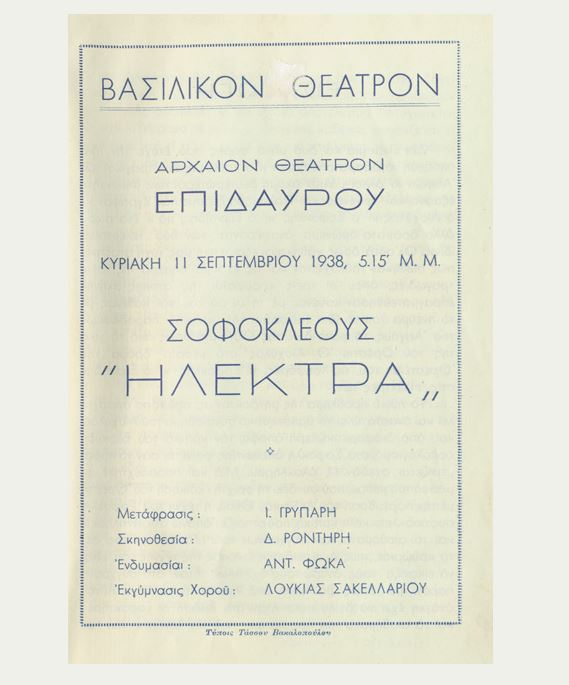 Με αυτά τα λόγια ο Τύπος της εποχής περιέγραφε την πρώτη -μετά την αρχαιότητα- παράσταση που δόθηκε στο Αρχαίο Θέατρο της Επιδαύρου. Ήταν 11 Σεπτεμβρίου του 1938 όταν ανέβαινε στο “ωραιότερο θέατρο του κόσμου” η Ηλέκτρα του Σοφοκλή, από το Εθνικό Θέατρο σε σκηνοθεσία του Δημήτρη Ροντήρη.