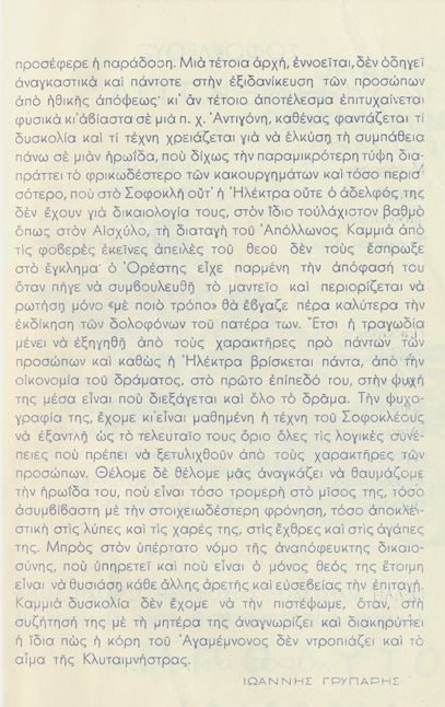 “Ανέζησε η Σοφόκλειος Τραγωδία, ανέζησε η Ηλέκτρα εμπρός εις το πολυάριθμον κοινόν που εξεκίνησε όχι μόνον από τας Αθήνας δια να παρακολουθήση την υψηλήν αυτήν μυσταγωγίαν αλλά και από πολλάς γειτονικάς της Επιδαύρου γωνίας της Πελοποννήσου”.