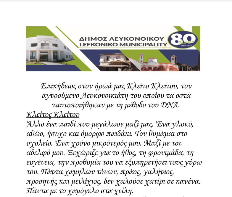 ΔΗΜΟΣ ΛΕΥΚΟΝΟΙΚΟΥ. Επικήδειος στον ήρωά μας Κλείτο Κλείτου, τον αγνοούμενο Λευκονοικιάτη του οποίου τα οστά ταυτοποιήθηκαν με τη μέθοδο του DNA.