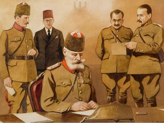 Ο Ταχσίν Πασάς υπογράφει το πρωρόκολλο παράδοσης της Θεσσαλονίκης στην Ελλάδα