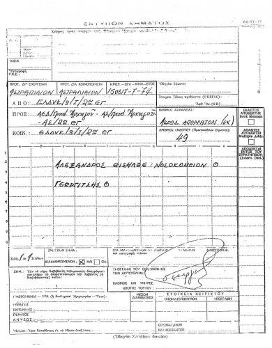 Ημερομηνία 15-7-74 ώρα 8.17 το πρωί, αριθμός πρωτοκόλλου σήματος 49.