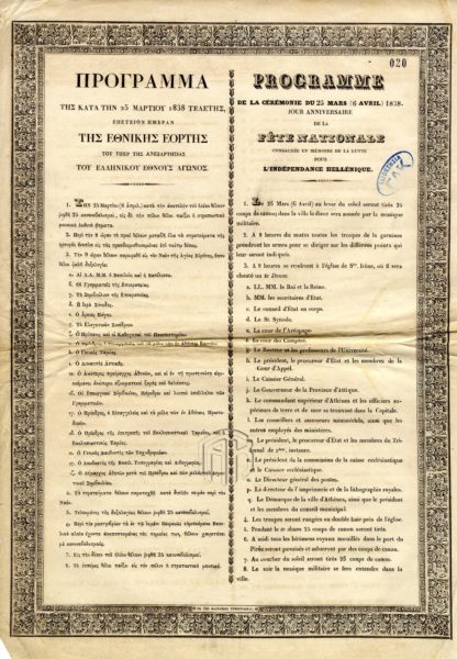 Το πρόγραμμα εορτασμού της κατά την 25η Μαρτίου 1838 εθνικής εορτής του υπέρ της ανεξαρτησίας του Ελληνικού Έθνους Αγώνος