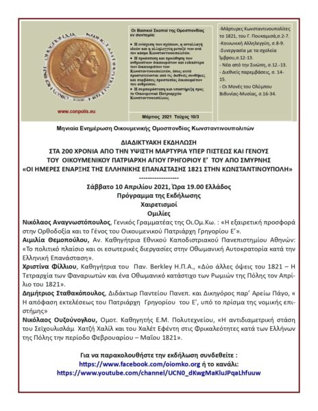 Η ομιλία, που μπορείτε να παρακολουθήσετε στον παρακάτω σύνδεσμο, έγινε στο πλαίσιο διαδικτυακής εκδήλωσης με τίτλο: «Οι ημέρες έναρξης της Ελληνικής Επανάστασης 1821 στην Κωνσταντινούπολη», στην οποία συμμετείχαν ακόμα οι εξαίρετοι καθηγητές, Αιμιλία Θεμοπούλου, Νικόλαος Ουζούνογλου (πρόεδρος της Οιμ.Κω), Χριστίνα Φίλλιου, Δημήτριος Σταθακόπουλος.