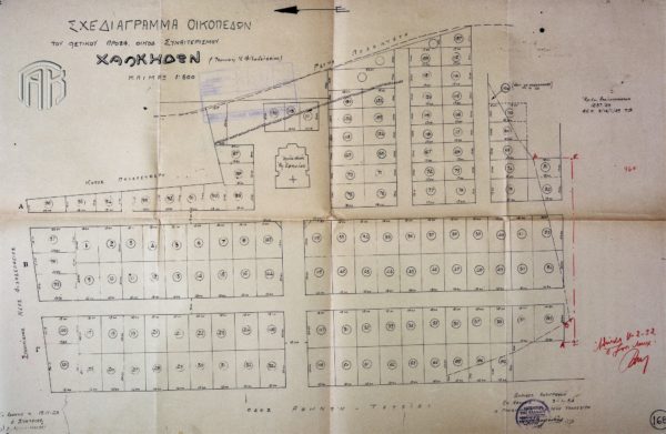 Σχεδιάγραμμα του 1928 των οικοπέδων του Αστικού Προσφυγικού Συνεταιρισμού Χαλκηδών (Περιοχή Ν. Φιλαδελφείας)», μεταξύ του ρεύματος Ποδονίφτη και της οδού Αθηνών-Τατοΐου.
