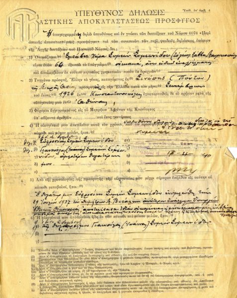 Υπεύθυνη Δήλωση Αστικής Αποκατάστασης πρόσφυγα από τη Σινώπη του Πόντου, με την οποία δηλώνει την επιθυμία της να αγοράσει κρατική κατοικία στον Προσφυγικό Συνοικισμό Νέας Φιλαδελφείας (Ποδονίφτη), όπου εγκαταστάθηκε από το 1927.