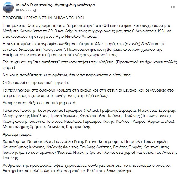 Ιστορική φωτογραφία που απεικονίζει ανθρώπους να συνεργάζονται για την επισκευή της στέγης στον Ιερό Ναό Αγίου Νικολάου Ανιάδος, το 1961, αναρτήθηκε στη σελίδα του Facebook “Ανιάδα Ευρυτανίας – Αγαπημένη γενέτειρα”.