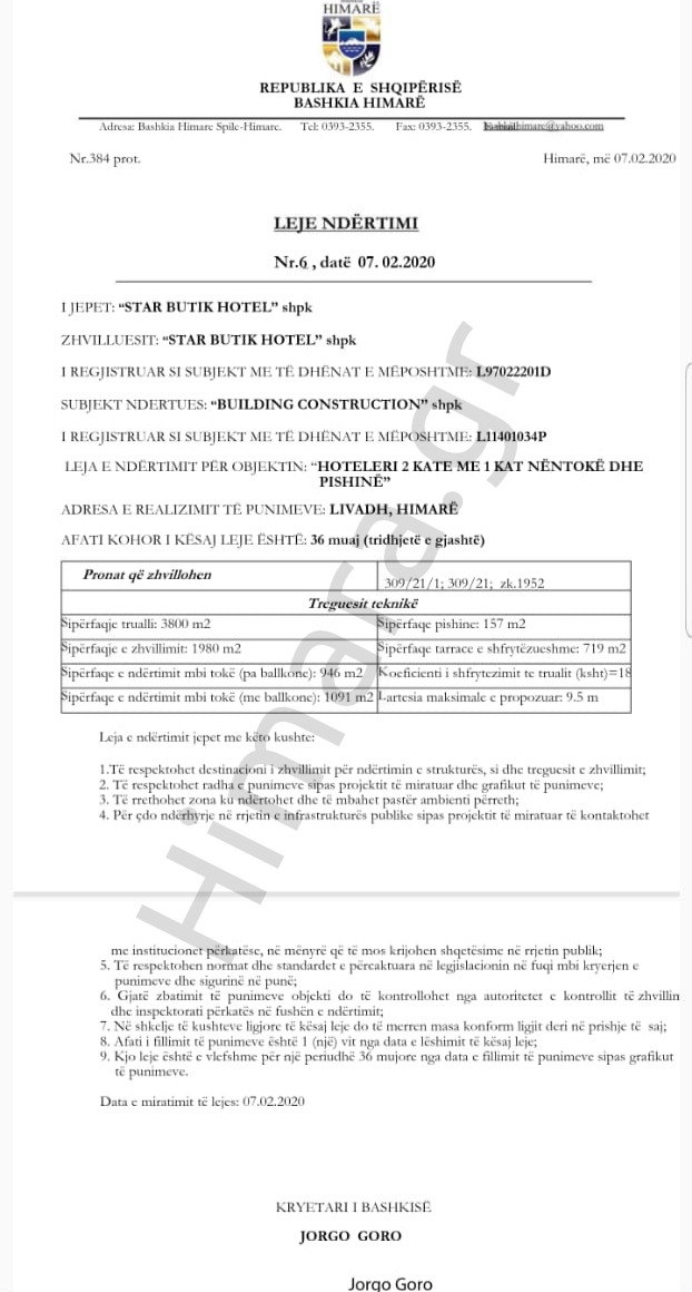Όπως βλέπετε στο έγγραφο η άδεια εκδόθηκε με διαδικασίες fast track, παρόλο που σε κατοίκους της Χιμάρας δεν εκδίδουν άδεια ούτε καν για την ανακαίνιση του σπιτιού τους.