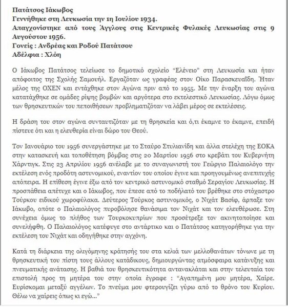 «Ψάλλε, προσεύχου, δόξαζε τον Θεόν σ’ όλη σου τη ζωή», έγραφε στην τελευταία επιστολή στη μητέρα του. Αυτός ήταν ο Ιάκωβος Πατάτσος, ο Ιάκωβός μας. Ο Ιάκωβος Πατάτσος, ήταν από τους πρώτους ήρωες που οδηγήθηκαν στην αγχόνη, μετά τους ήρωες Μιχαλάκη Καραολή και Ανδρέα Δημητρίου.