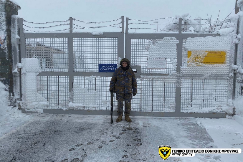 Επίκαιρη φωτογραφία, όπως αυτή δημοσιεύεται εκ μέρους του επισήμου διαδικτυακού ιστοτόπου του Γενικού Επιτελείου Εθνικής Φρουράς (www.army.gov.cy). Το ισχυρό ψύχος και το χιόνι ντύνουν στα άσπρα ακόμη και το συρματόπλεγμα της Πύλης, αλλά η αγάπη για την πατρίδα βαστάει το χαμόγελο του φρουρού.