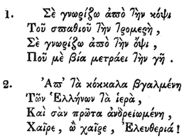 και σαν πρώτα ανδρειωμένη, χαίρε, ω χαίρε, Ελευθεριά!