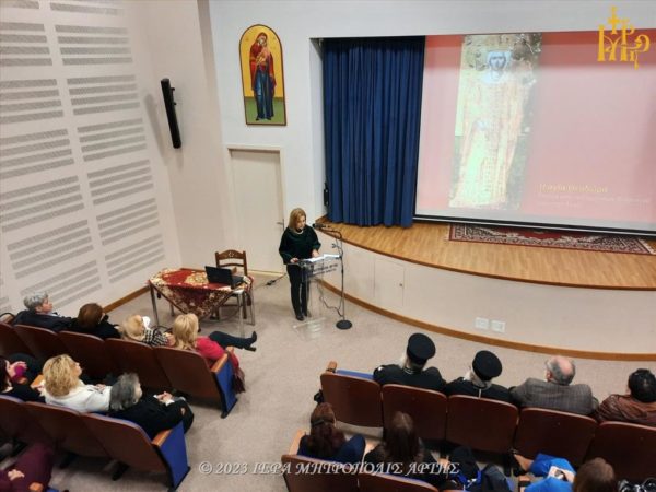 Μίλησε η Δρ Βυζαντινής Αρχαιολογίας κ. Βαρβάρα Παπαδοπούλου, Προϊσταμένη της Εφορείας Αρχαιοτήτων Άρτας και Αναπληρώτρια Προϊσταμένη της Εφορείας Αρχαιοτήτων Ιωαννίνων, με θέμα: “Θεοδώρα Πετραλείφα – Άννα Παλαιολογίνα Καντακουζηνή: Δύο σημαντικές γυναικείες μορφές της βυζαντινής Άρτας”.