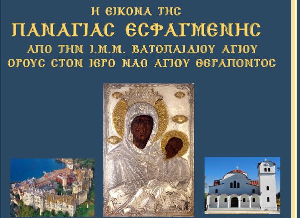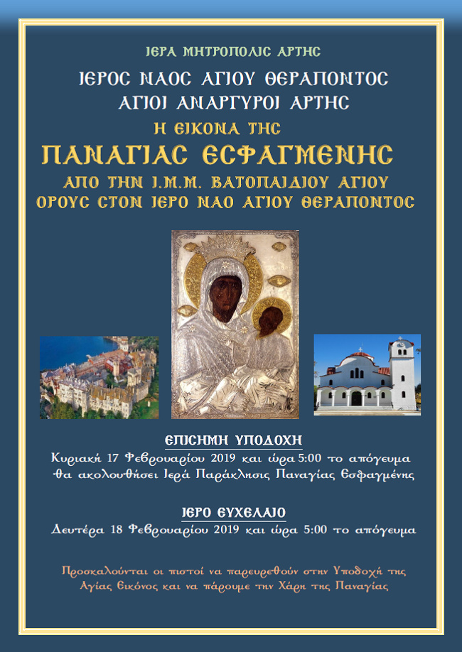 Την εικόνα της Παναγίας Εσφαγμένης από την Ιερά Μεγίστη Μονή Βατοπαιδίου θα υποδεχτεί την Κυριακή 17 Φεβρουαρίου ο Ιερός Ναός του Αγίου Θεράποντα στην Άρτα.