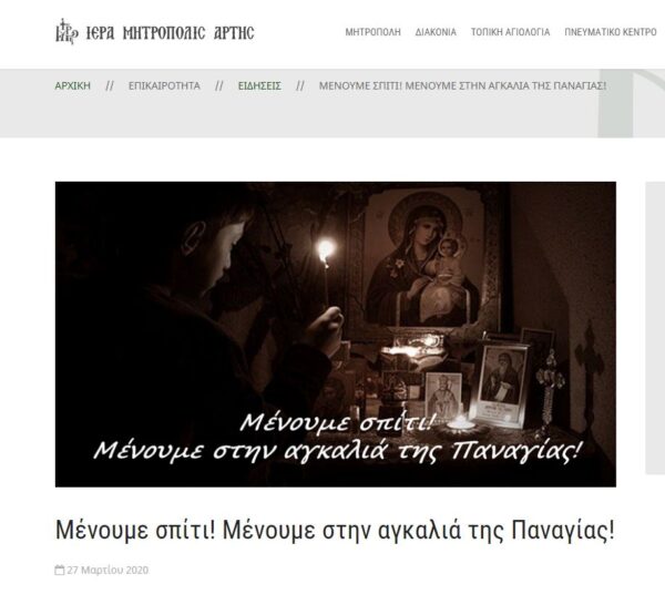 “Μένουμε σπίτι! Μένουμε στην αγκαλιά της Παναγίας!” λέει το διαδικτυακό μήνυμα της Ιεράς Μητροπόλεως Άρτης, κατά την 27η Μαρτίου 2020, όπως αυτό δημοσιεύεται στην επίσημη ιστοσελίδα της.