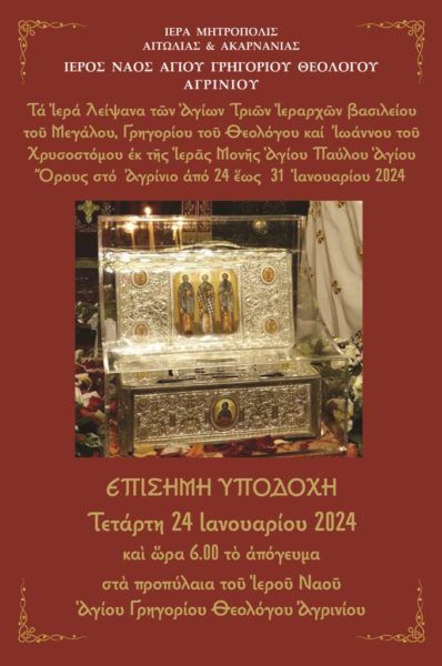 Την Τετάρτη 24 Ιανουαρίου και ώρα 6:00’ το απόγευμα στα προπύλαια του Ιερού Ναού Αγίου Γρηγορίου Θεολόγου Αγρινίου θα πραγματοποιηθεί η επίσημη υποδοχή των Ιερών Λειψάνων των Αγίων Τριών Ιεραρχών, Βασιλείου του Μεγάλου, Γρηγορίου του Θεολόγου και Ιωάννου του Χρυσοστόμου, εκ της Ιεράς Μονής Αγίου Παύλου Αγίου Όρους, από τον Σεβασμιώτατο Μητροπολίτη Αιτωλίας και Ακαρνανίας κ. Δαμασκηνό, τον Ιερό Κλήρο, τις Αρχές και τον πιστό λαό της πόλεως. Τα Χαριτόβρυτα Ιερά Λείψανα θα κομίσουν Πατέρες της Ιεράς Μονής Αγίου Παύλου.