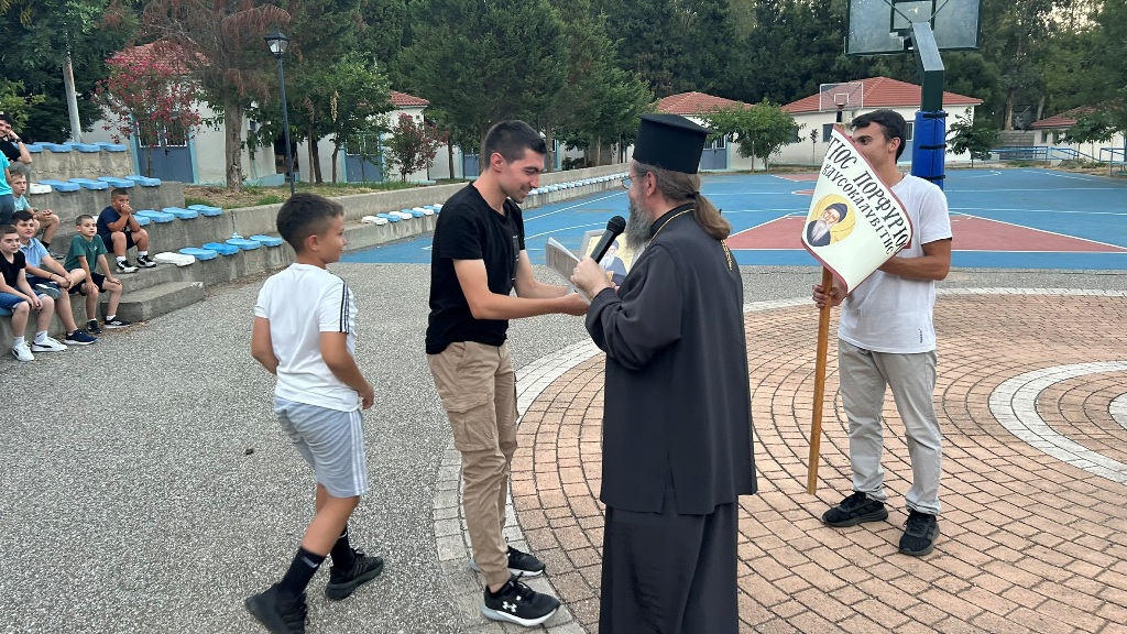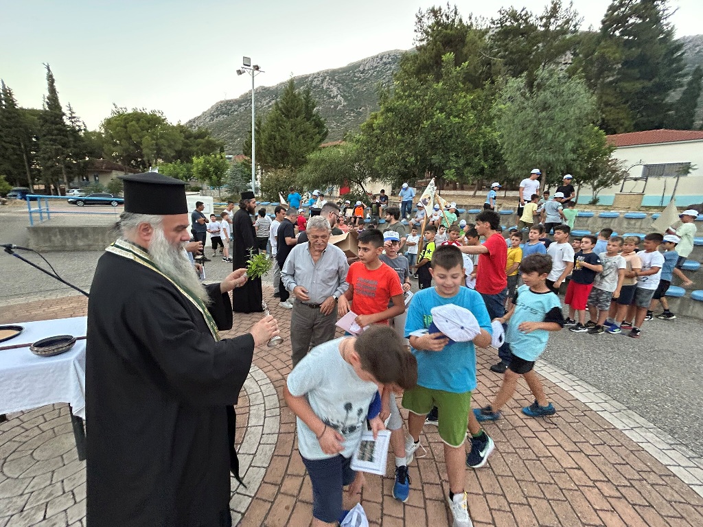 «Κοινωνία Χριστού», καθώς και τα ονόματα των οκτώ ομάδων, μαζί με τις σημαίες και τα λάβαρά τους και ευχήθηκε να περάσουν μια ευλογημένη, χαρούμενη και καρποφόρα κατασκηνωτική περίοδο που θα ξεκουράσει, θα οικοδομήσει πνευματικά και θα ωφελήσει τα παιδιά.
