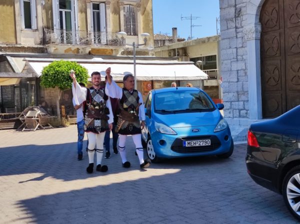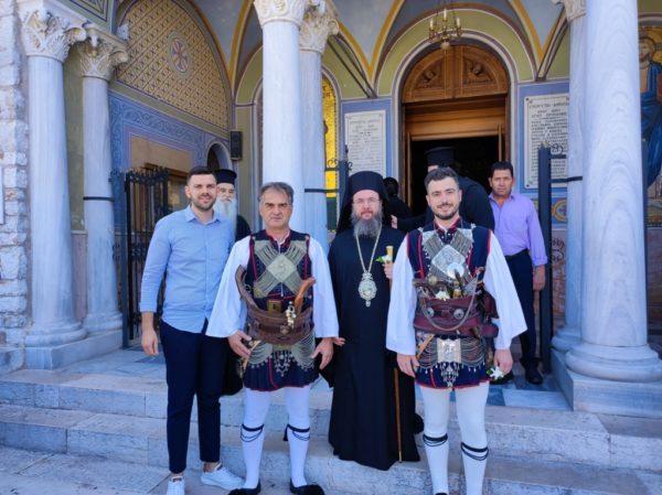 Μετά την απόλυση της Θείας Λειτουργίας, μια παρέα αρματωμένων προσήλθαν στον Ιερό Ναό του Αγίου Σπυρίδωνος για να λάβουν την ευλογία και τις ευχές του Σεβασμιωτάτου Μητροπολίτη κ. Δαμασκηνού και να συνεχίσουν το τυπικό της πανήγυρης.