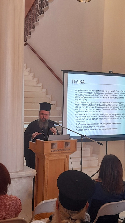 Ο Σεβασμιώτατος υπογράμμισε ότι δεν είμαστε ιδιοκτήτες, αλλά διαχειριστές των εκκλησιαστικών μνημείων και τόνισε, ότι οι προθέσεις όλων είναι καλές και αυτό αποτελεί μια γενική παραδοχή, ενώ επεσήμανε και τις αντικειμενικές και πρακτικές δυσκολίες, όπως η μακροχρόνια ύπαρξη εφημεριακών κενών στις Ενορίες της υπαίθρου, η έλλειψη οικονομικών πόρων για την συντήρηση των μνημείων, τόσο από πλευράς της Εφορείας όσο και από πλευράς της Ιεράς Μητροπόλεως.