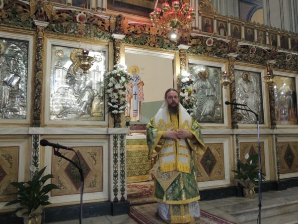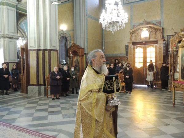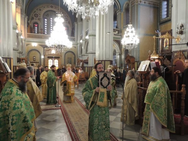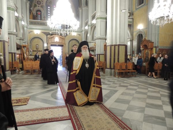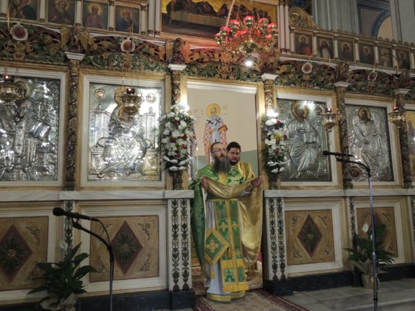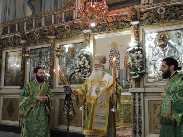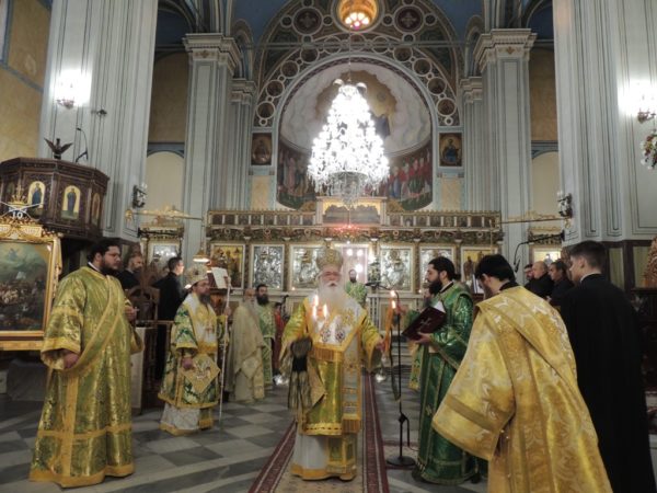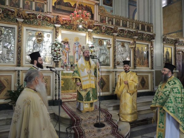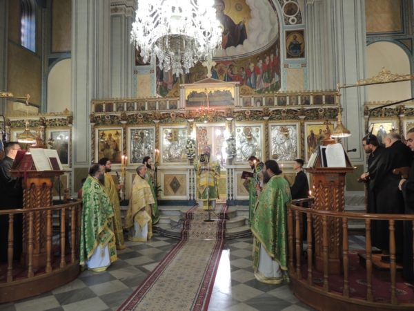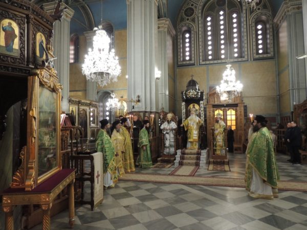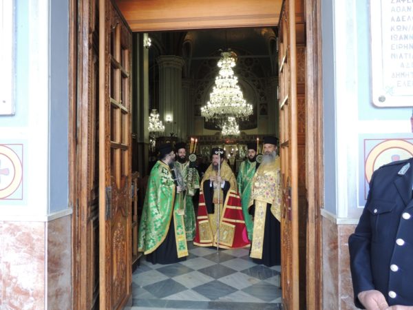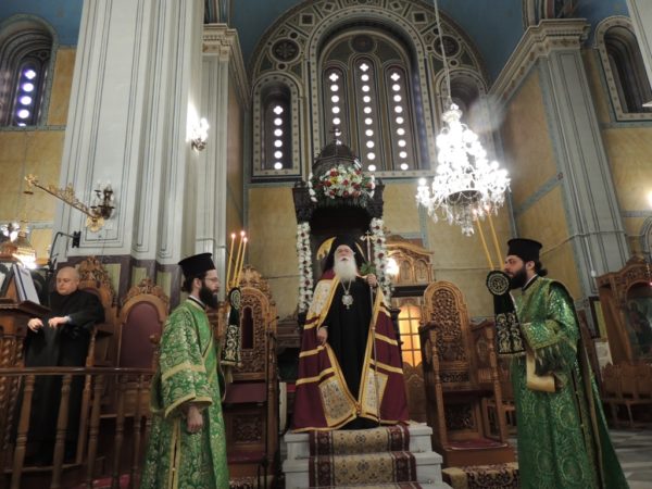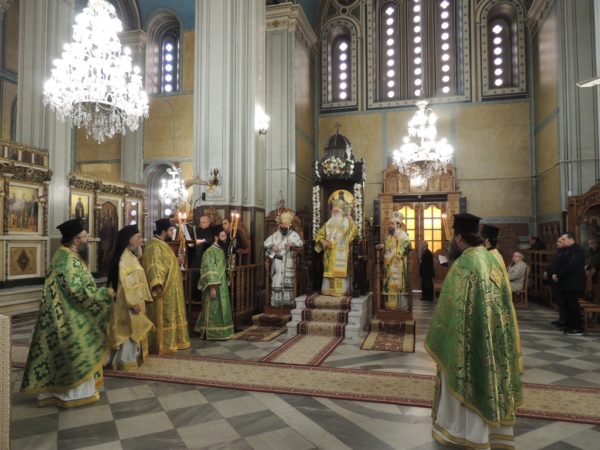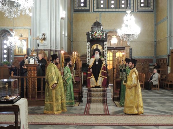 Στον Ιερό Μητροπολιτικό Ναό Αγίου Σπυρίδωνος τελέσθηκαν ο Όρθρος και η τρισαρχιερατική Θεία Λειτουργία, προεξάρχοντος του Μητροπολίτη Δημητριάδος και Αλμυρού κ. Ιγνατίου και συλλειτουργούντων του Επισκόπου Τεγέας κ. Θεοκλήτου και του οικείου Ποιμενάρχου, Μητροπολίτη Αιτωλίας και Ακαρνανίας κ. Δαμασκηνού.
