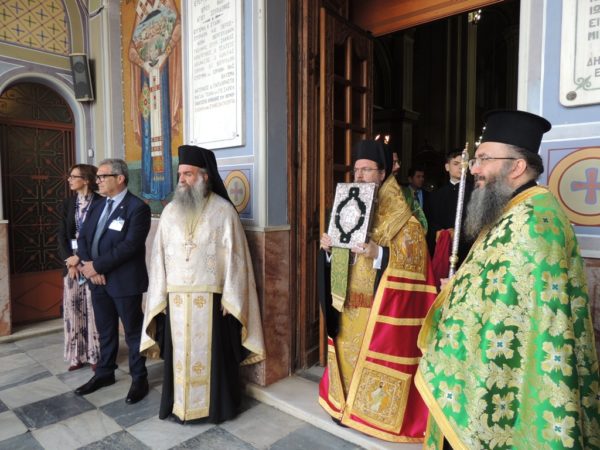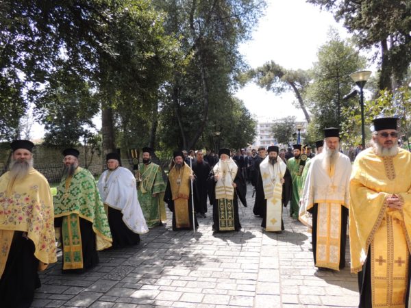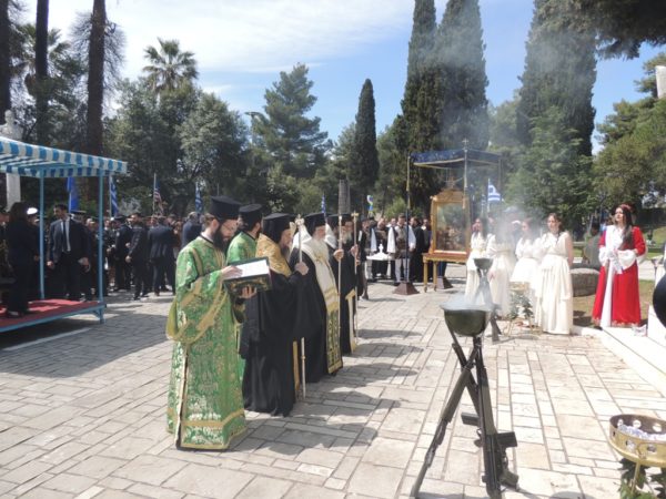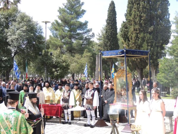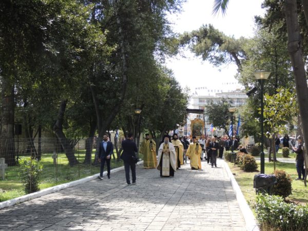 Με την ιερά λιτανεία μεταφέρθηκε η Εικόνα της Εξόδου, το Ιερό Λάβαρο και ο Σταυρός Ευλογίας του Επισκόπου Ρωγών Ιωσήφ στον Κήπο των Ηρώων της Ιεράς Πόλεως.