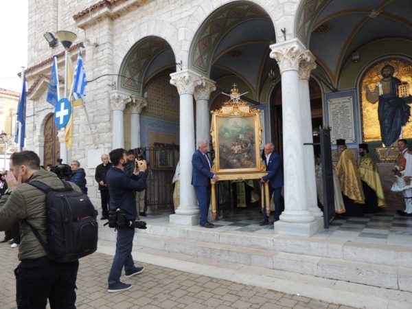 Σε άλλο σημείο ανέφερε: «Το Μεσολόγγι δεν έπεσε ποτέ!…. Το Μεσολόγγι τινάχτηκε στα ύψη του ουρανού, μέσα στην πιο λαμπρή έκρηξη του κοσμογονικού ηφαιστείου του 1821. Έγινε αγίασμα «τῷ Κυρίῳ». Από το ύψος εκείνο «κρατά», όπως θα έλεγε ο Γιάννης Ρίτσος, «τον ήλιο το νιοβάφτιστο που στάζει απ’ του ουρανού την κολυμπήθρα». Ο Σεβασμιώτατος ολοκληρώνοντας τον χαιρετισμό του προσέφερε στην κ. Πρόεδρο μια εικόνα του Αγίου Κοσμά του Αιτωλού, ως ενθύμιο της επισκέψεως της.