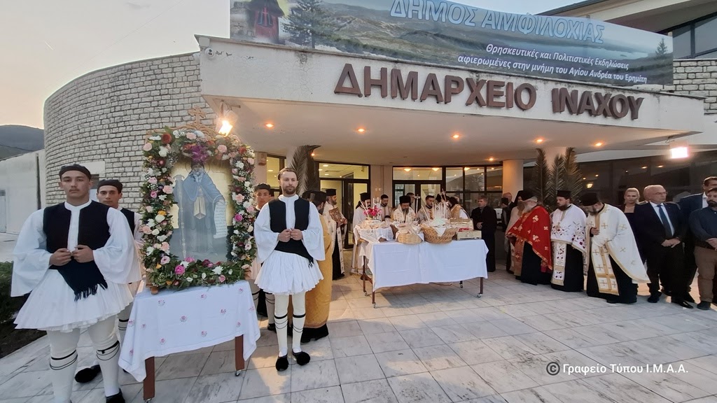 Τέλος, ευχαρίστησε τον Αρχιερατικό Επίτροπο Ινάχου και Προϊστάμενο του Ιερού Ναού, Αρχιμ. Αμβρόσιο Σιώρο και τους συνεργάτες του για την προετοιμασία της ιεράς πανηγύρεως, τους Ιερείς των Αρχιερατικών Περιφερειών Ινάχου και Αμφιλοχίας, τους Αντιπεριφερειάρχες κ. Θανάση Μαυρομμάτη και κ. Νικόλαο Κατσακιώρη, τον Δήμαρχο Αμφιλοχίας κ. Θανάση Τορουνίδη και όλους τους εκπροσώπους των Αρχών, την Φιλαρμονική του Δήμου Αμφιλοχίας, τα μέλη των Παραδοσιακών Συλλόγων και όλους τους πιστούς που συμμετείχαν στην Ακολουθία του Εσπερινού και στην Ιερά Λιτανεία.
