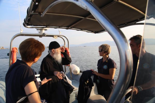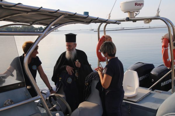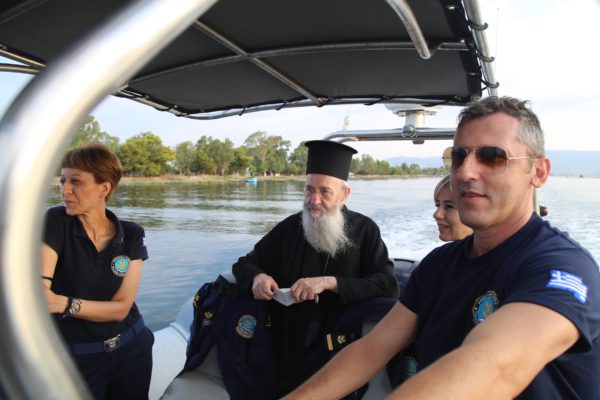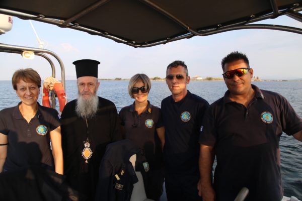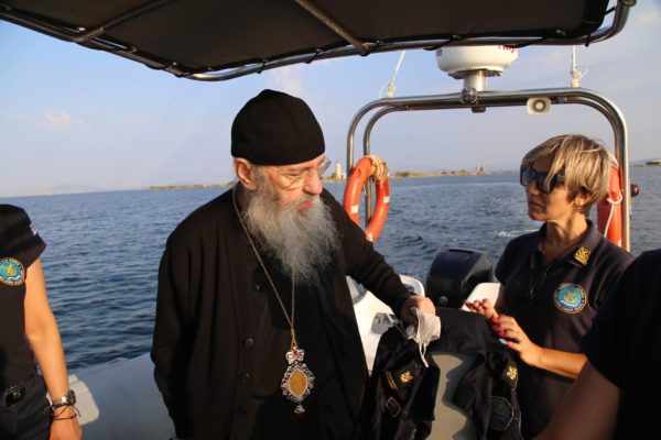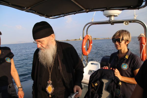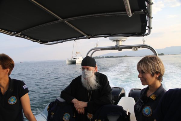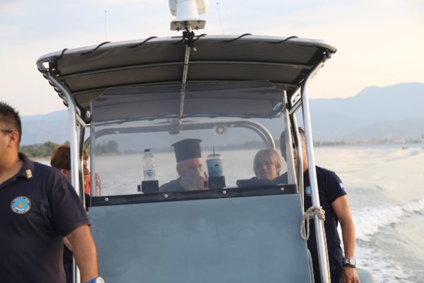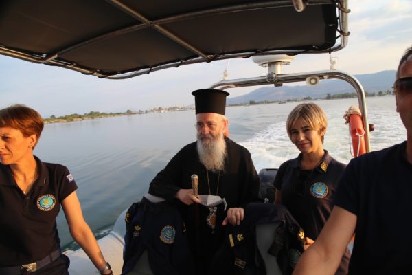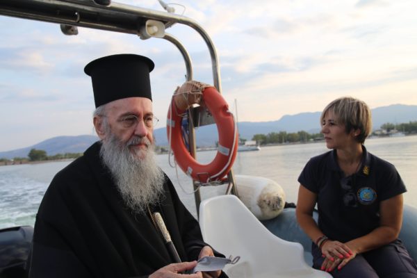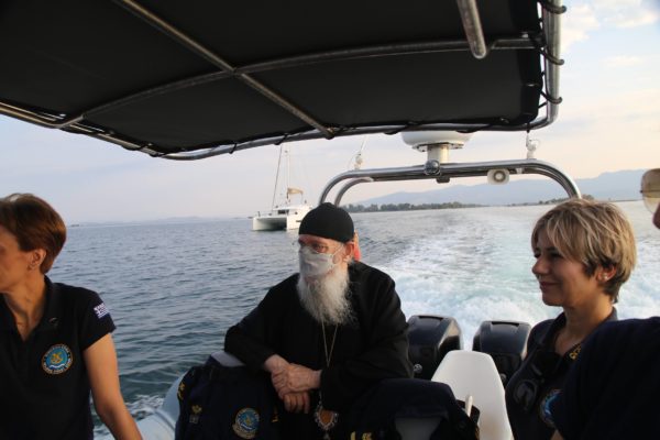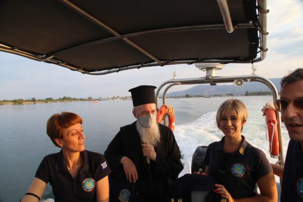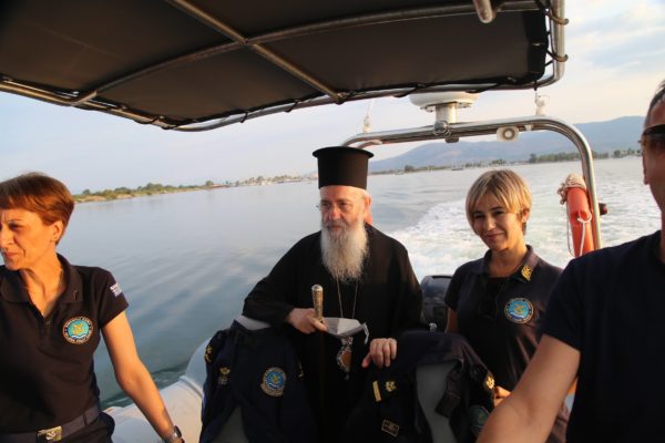 Ο Σεβασμιώτατος επιβιβάστηκε σε περιπολικό σκάφος του Λιμεναρχείου Μεσολογγίου συνοδευόμενος από την Λιμενάρχη, Υποπλοίαρχο Λ.Σ. κ. Κυριακή Σκανδάλου, τον κυβερνήτη του σκάφους, Σημαιοφόρο Λ.Σ. κ. Νεκτάριο Ζησιμόπουλο, τον Ανθυπασπιστή Λ.Σ. κ. Γεώργιο Κακούτη και την Ανθυπασπιστή Λ.Σ. κ. Γλυκερία Σοροβού.