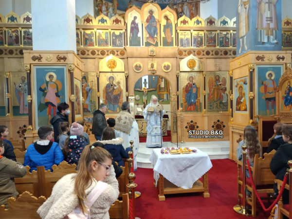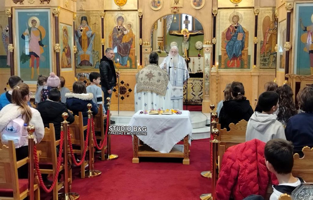 Στην Θεία Λειτουργία παρευρέθηκαν και συμμετείχαν μαθητές από το 4ο Δημοτικό Σχολείο Ναυπλίου.