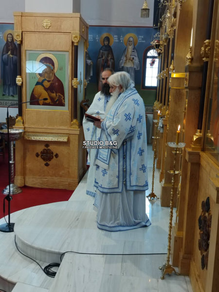 Την λειτουργία τέλεσε ο Σεβασμιώτατος Μητροπολίτης Αργολίδος κ. Νεκτάριος, ο οποίος και προσκόμισε στο ναό τεμάχιο των λειψάνων του.