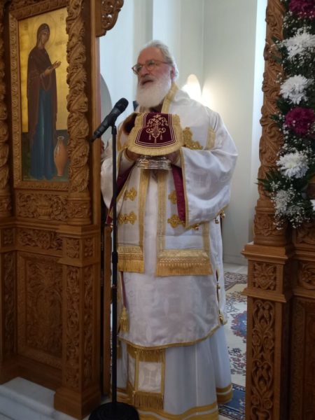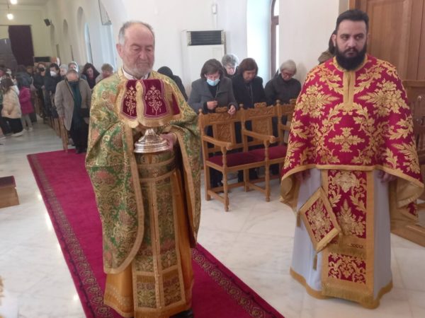 Ο Σεβασμιώτατος τέλεσε τη Θεία Λειτουργία, συμπαραστατούμενος από τον Πρωτοπρεσβύτερο Εμμανουήλ Κοσιδεκάκη, τον Οικονόμο Ιωάννη Καπελλάκη και τον Αρχιδιάκονο Μαρίνο Δασκαλάκη, ενώ συμπροσευχόμενοι παρέστησαν ο Προϊστάμενος της Ενορίας και Αναπληρωτής Γενικός Αρχιερατικός Επίτροπος Πρωτοπρεσβύτερος Σπυρίδων Φουκαράκης και ο Πρωτοπρεσβύτερος Εμμανουήλ Κιοστεράκης, το δε αναλόγιο διακόνησε ο Διάκονος Πέτρος Αράπογλου.