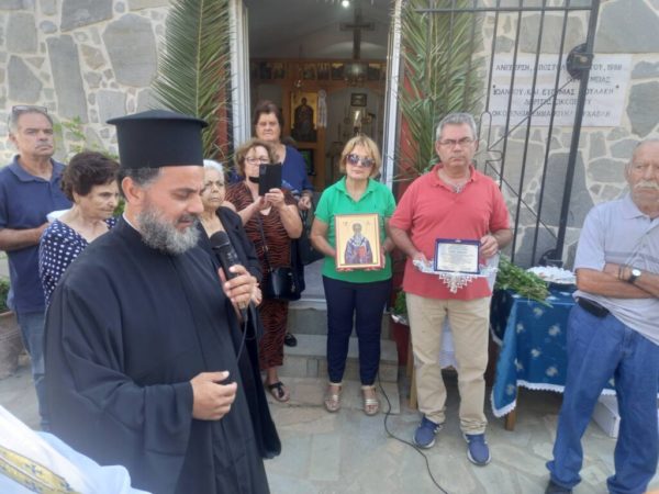 Τέλος, επέδωσε τιμητική πλακέτα στον κτήτορα του Ναού κ. Ιωάννη Χουλάκη ως ένδειξη ευχαριστίας για την προσφορά του.