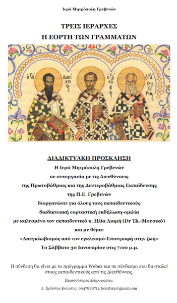 Διαδικτυακή εορταστική εκδήλωση-ομιλία για τους Τρεις Ιεράρχες διοργανώνει το Σάββατο στις 7 το απόγευμα η Ιερά Μητρόπολη Γρεβενών σε συνεργασία με τις διευθύνσεις της Πρωτοβάθμιας και της Δευτεροβάθμιας Εκπαίδευσης της Π.Ε. Γρεβενών. Καλεσμένος είναι ο εκπαιδευτικός κ. Ηλίας Λιαμής. Στην εκδήλωση θα συνδυαστεί η διδασκαλία των Τριών Ιεραρχών με το σύγχρονο θέμα: «Ο Απεγκλωβισμός από τον εγκλεισμό-Επιστροφή στη ζωή».