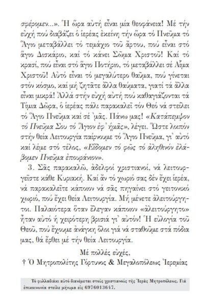 ΣΥΝΤΟΜΑ ΚΗΡΥΓΜΑΤΑ, Αριθμ. 3, υπό το θέμα “ΘΕΙΑ ΛΕΙΤΟΥΡΓΙΑ” εκ μέρους του Σεβασμιωτάτου Μητροπολίτου Γόρτυνος και Μεγαλοπόλεως κ. Ιερεμίου, όπου, μεταξύ άλλων, αναφέρει: “Τὰ σὰ ἐκ τῶν σῶν Σοὶ προσφέρομεν… Η ώρα αυτή είναι μία θεοφάνεια!”.