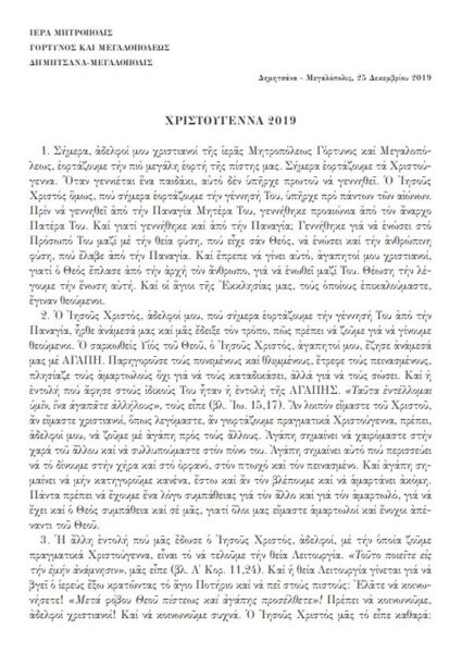 ΧΡΙΣΤΟΥΓΕΝΝΑ 2019 – ΔΙΑΒΑΣΤΕ ΕΔΩ ΑΝΑΛΥΤΙΚΑ την Εγκύκλιο του Σεβασμιωτάτου Μητροπολίτου Γόρτυνος και Μεγαλοπόλεως, κ. Ιερεμίου, όπου, καθώς ο Σεβασμιώτατος Μητροπολίτης αναφέρει:
