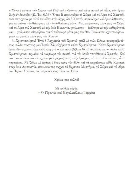 “Χριστιανοί μου! Ἐγώ ὁ Ἀρχιερεύς τοῦ Χριστοῦ, μαζί μέ τούς ἄλλους συμπρεσβυτέρους συλλειτουργούς μου Ἱερεῖς Σᾶς εὐχόμαστε καλά Χριστούγεννα.