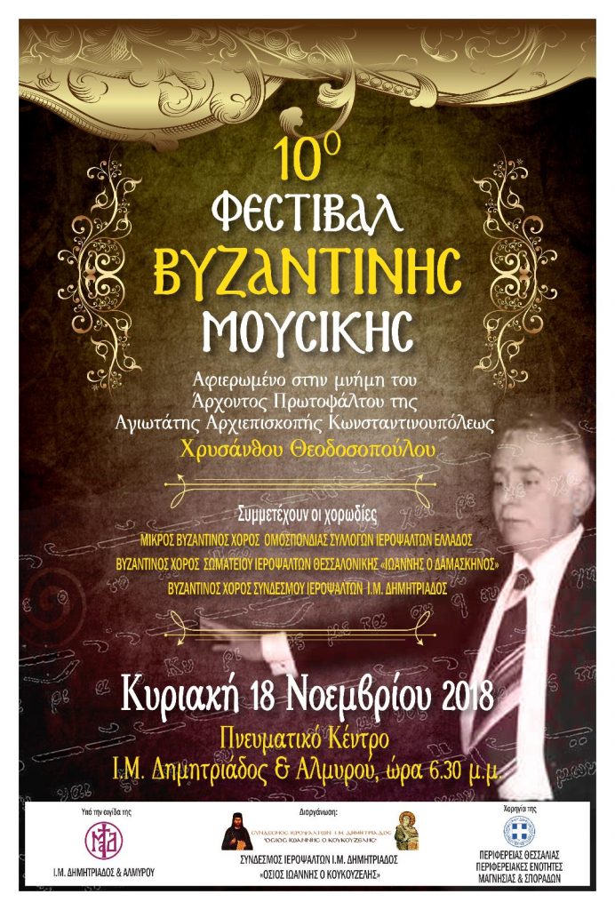 Πρόκειται για το 10ο Φεστιβάλ Βυζαντινής Μουσικής, που θα πραγματοποιηθεί την Κυριακή 18/11, στις 6.30μ.μ., στο Πνευματικό Κέντρο της Ιεράς Μητροπόλεως Δημητριάδος και Αλμυρού(Κ. Καρτάλη – Ανθ. Γαζή). Το Φεστιβάλ διοργανώνει ο Σύνδεσμος Ιεροψαλτών της Ιεράς Μητροπόλεως Δημητριάδος «Όσιος Ιωάννης ο Κουκουζέλης», υπό την αιγίδα της Τοπικής μας Εκκλησίας και με τη χορηγία της Περιφέρειας Θεσσαλίας.