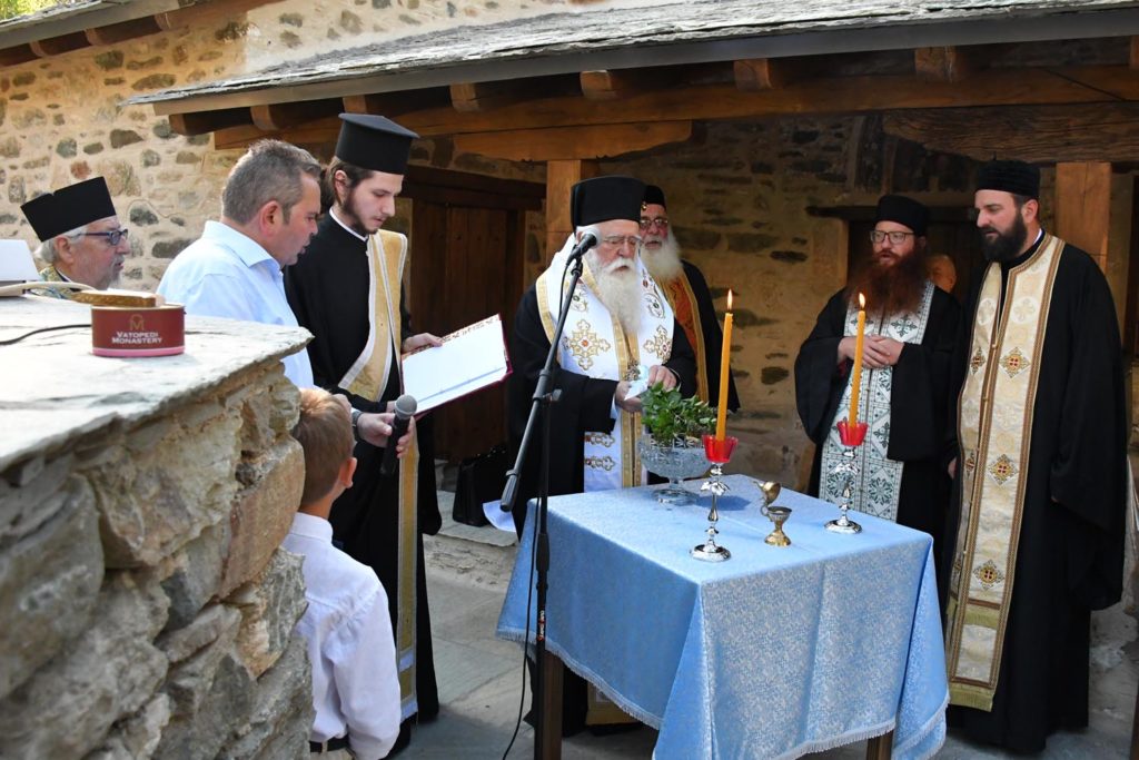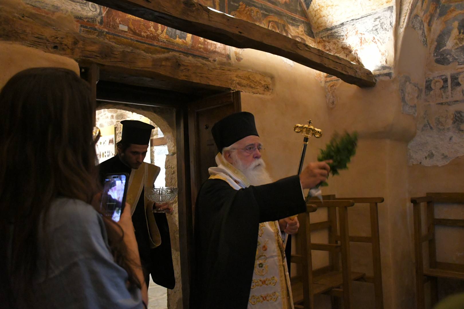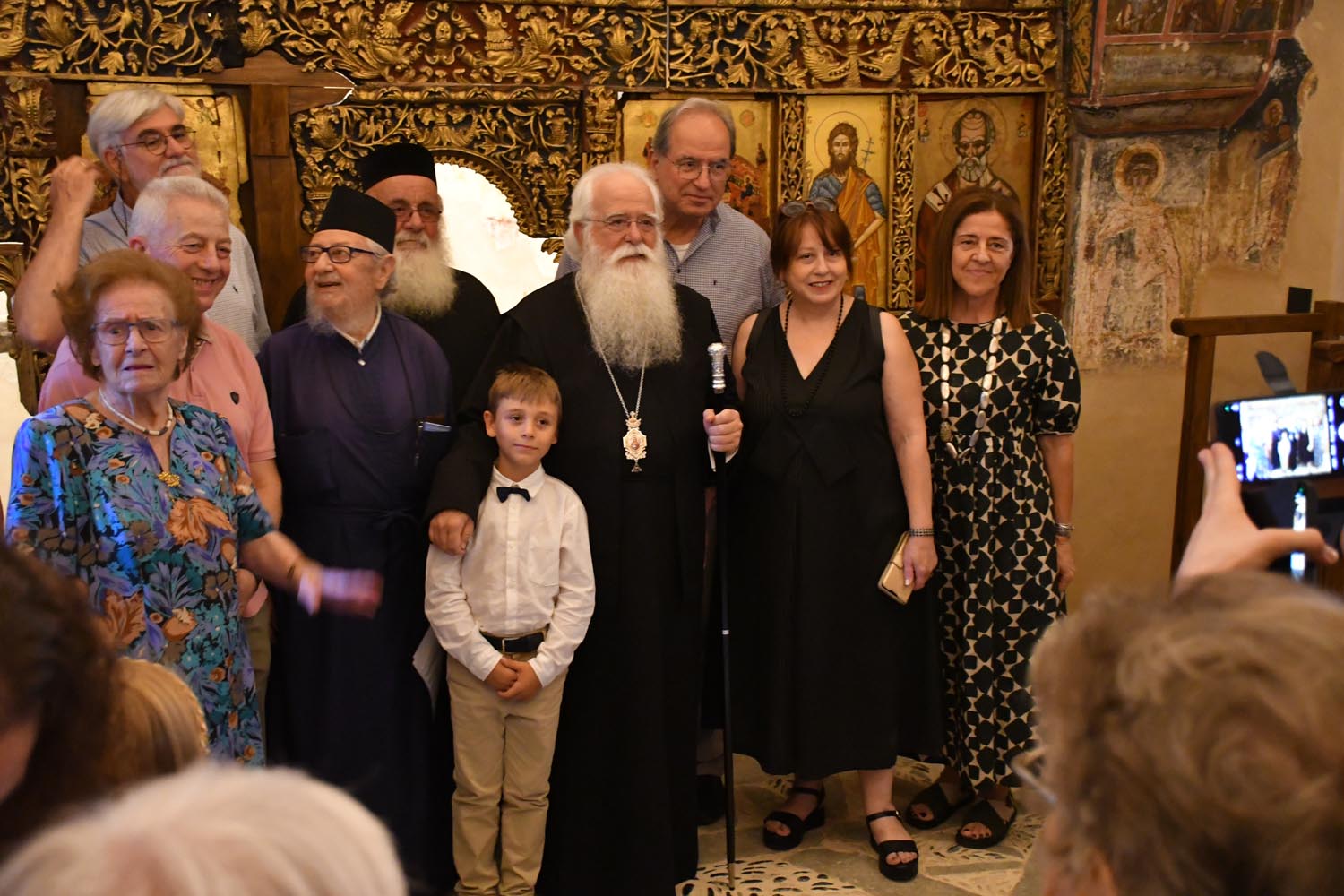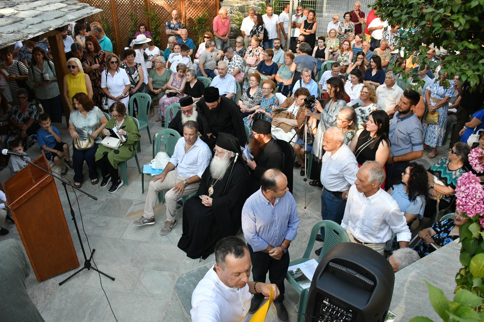 Στην ομιλία του ο Σεβασμιώτατος υπενθύμισε ότι «πατρίδα είναι τα παιδικά μας χρόνια […] Αυτό κράτησε μέσα της η σημερινή ευεργέτις […] συνεχίζοντας έτσι τη μεγάλη παράδοση των ευεργετών του τόπου», ενώ στη συνέχεια υπογράμμισε την τεράστια σημασία της καλής συνεργασίας Εκκλησίας, Πολιτείας και τοπικών φορέων για τη συντήρηση και προβολή των θρησκευτικών μνημείων.