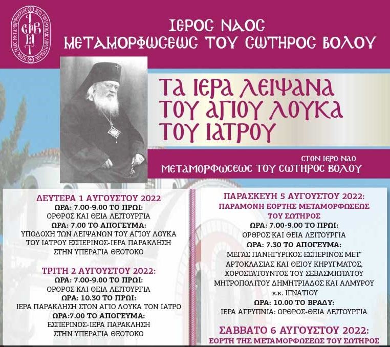Ιερά λείψανα του Αγίου Λουκά του Ιατρού, Αρχιεπισκόπου Συμφερουπόλεως και Κριμαίας, θα αφιχθούν στον Ιερό Ναό Μεταμορφώσεως του Σωτήρος Βόλου την Δευτέρα, 1η Αυγούστου.