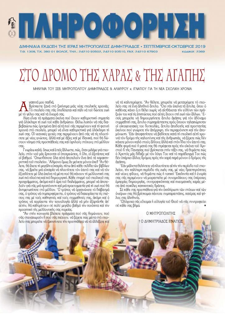 Κυκλοφορήθηκε το νέο τεύχος (Σεπτεμβρίου – Οκτωβρίου 2019) της διμηνιαίας έκδοσης της Ιεράς Μητροπόλεως Δημητριάδος «Πληροφόρηση», η οποία είναι αφιερωμένη στην έναρξη της νέας Σχολικής χρονιάς.
