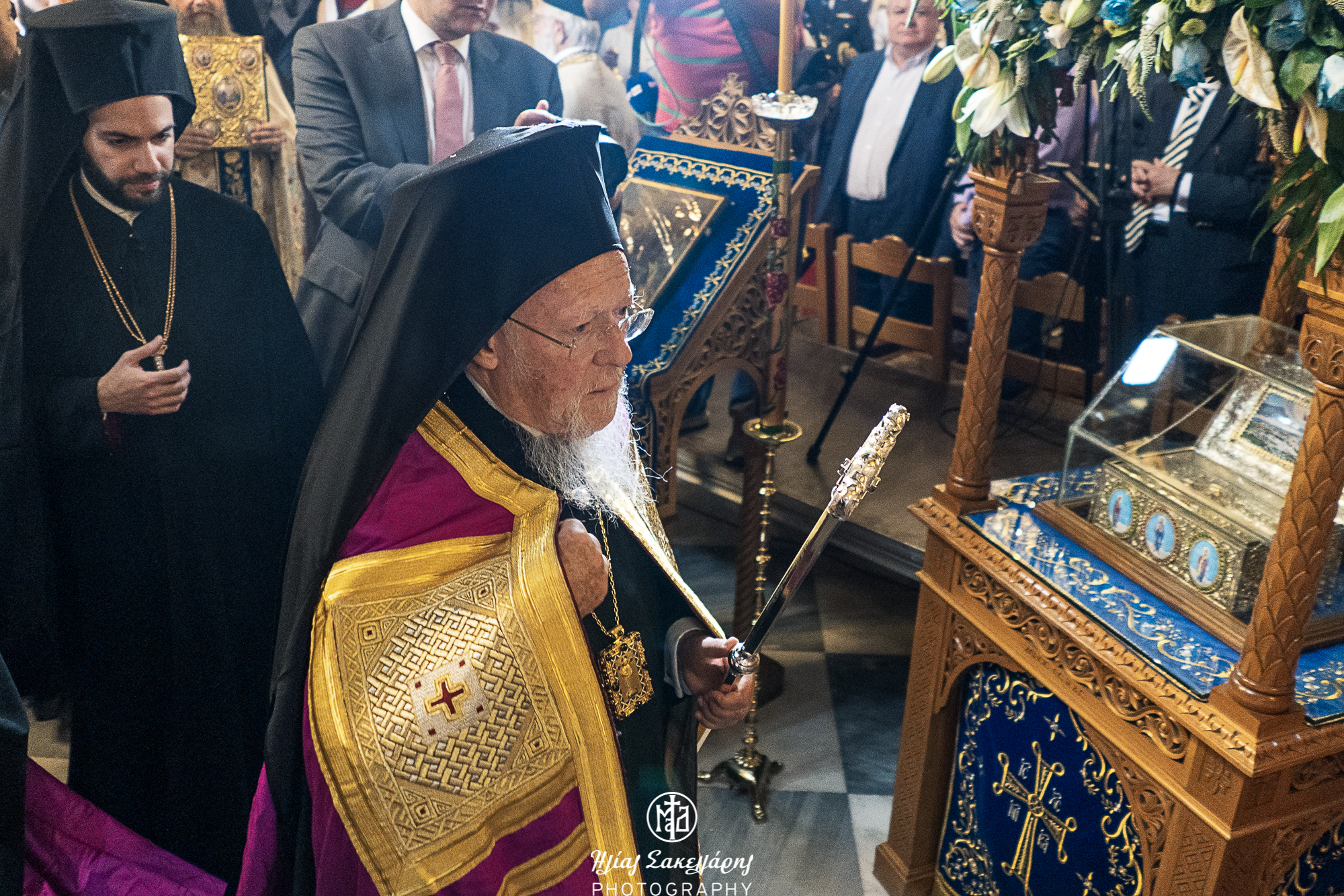 Εκ μέρους του Ιερού Ναού προσφώνησε τον Προκαθήμενο της Ορθοδοξίας ο Αρχιμανδρίτης Επιφάνιος Οικονόμου. Ο Αρχιμανδρίτης Επιφάνιος από την πλευρά του, o οποίος του προσέφερε ένα ασημένιο Ευαγγέλιο για τον ιερό ναό της Μεταμορφώσεως του Σωτήρος στη γενέτειρά του την Ίμβρο.