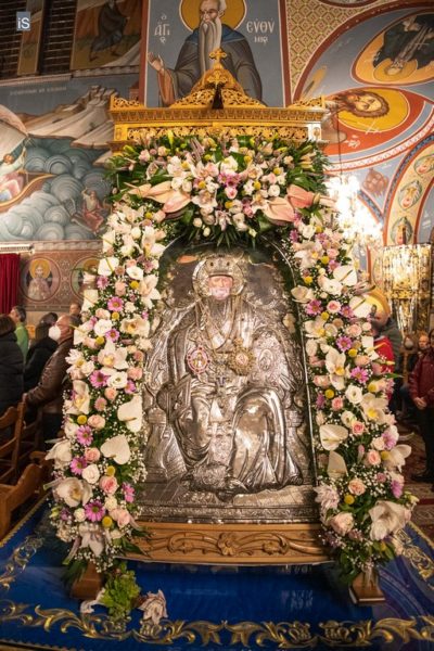Αναφερόμενος δε στον μεγάλο σύνδεσμο του λαού μας με τον Άγιο Νικόλαο παρατήρησε ότι «ο Άγιος είναι σωματικά ανάμεσά μας διά του αγίου Λειψάνου του και ταυτόχρονα ολοζώντανος στο πλευρό μας σε κάθε επίκλησή μας. Από τον θρόνο του Θεού, άπου παραστέκεται, προστρέχει κάθε φορά που τον καλούμε με πίστη και αγάπη. Αυτό που ζητεί και περιμένει από μας είναι να ακολουθήσουμε το παράδειγμα του γιου βίου του, να βαδίσουμε στα ίχνη του, να μιμηθούμε τις αρετές του. Αυτό θα είναι το δώρο που περιμένει να του κάνουμε στη γιορτή του, αυτή είναι η πρέπουσα τιμή που μπορούμε και αξίζει να προσφέρουμε προς το πανάγιο πρόσωπό τούτο…».