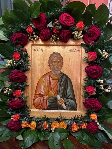 Ανήμερα της εορτής, ο Σεβασμιώτατος προεξήρχε της πανηγυρικής Θείας Λειτουργίας, συλλειτουργούντων των Βοηθών Επισκόπων του Μητροπολίτου Γερμανίας, Θεοφιλεστάτων Αριανζού κ. Βαρθολομαίου και Αργυρουπόλεως κ. Αμβροσίου, παρουσία και πάλι, μεγάλου πλήθους προσκυνητών. Ευχαρίστησε τους δύο Επισκόπους για την συλλειτουργία, εκτίμησε το έργο και την προσφορά τους στην Μητρόπολη Γερμανίας και ευχαρίστησε τον π. Θεοφάνη για την τιμή της προσκλήσεως. Στο κήρυγμά του αναφέρθηκε στις Θείες εμπειρίες που έζησε ο Απόστολος Ανδρέας, ο οποίος, ως Μαθητής του Κυρίου, Τον ακολούθησε σε όλους τους σταθμούς της επί γης ζωής Του, πριν ο ίδιος καταλήξει στο Μαρτύριο για την αγάπη του Χριστού. Ο Σεβασμιώτατος τόνισε πως την ίδια εμπειρία ζούμε κι εμείς σε κάθε Θεία Λειτουργία, όπου βλέπουμε τον Χριστό να γεννιέται, να ευαγγελίζεται τον λόγο της σωτηρίας, να παραθέτει, διά του Αγίου Πνεύματος, το Δείπνο της Ευχαριστίας. Ευχαρίστησε, τέλος, για την χαρά του συνεορτασμού και της συλλειτουργίας, εκζητώντας τις προσευχές όλων.