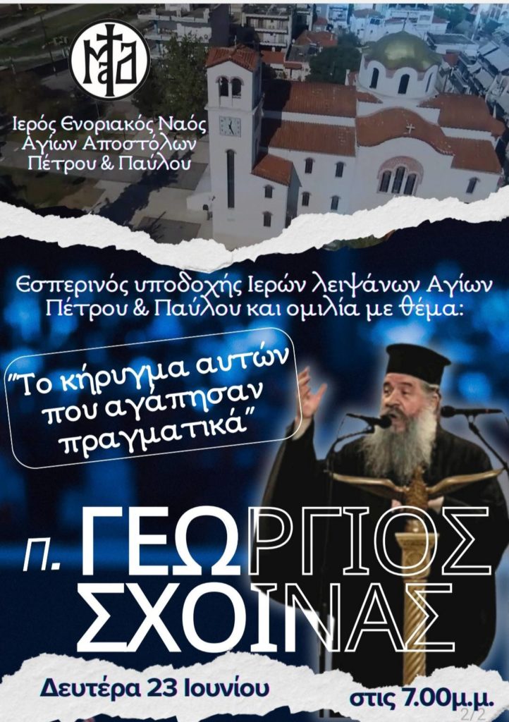 Θα ακολουθήσει ομιλία του π. Σπυρίδωνος Βασιλάκου με θέμα: «Η πορεία των Αγίων Αποστόλων και η πορεία μας».