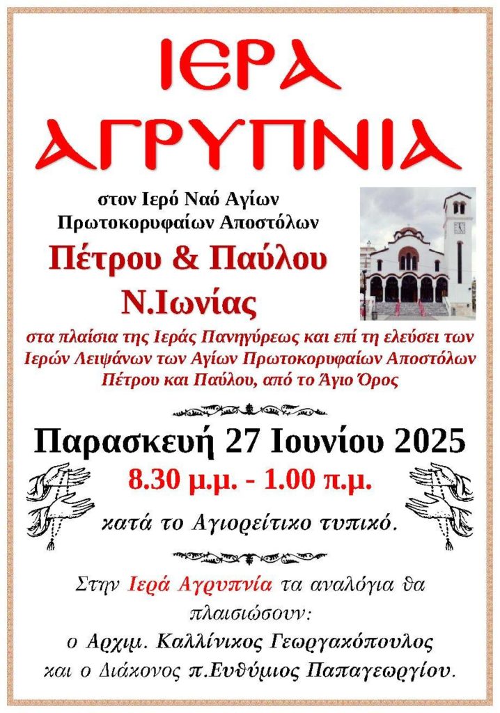 6:30 μ.μ. Εσπερινός και Ιερά Παράκληση προς τους Αγίους Αποστόλους Πέτρο & Παύλο.